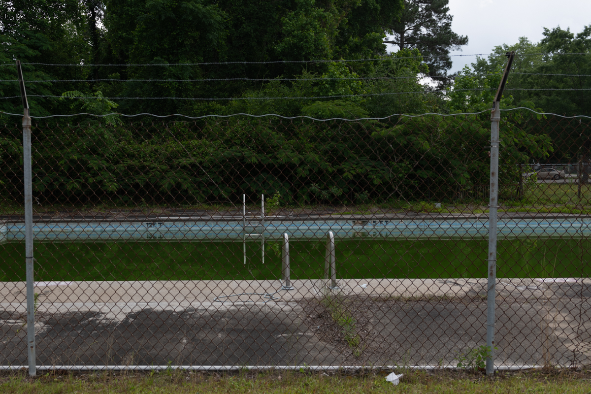 Nowadays, the Fair Bluff pool is decrepit. Broken skimmers have prevented it from draining, so trash floats atop the algae-filled water, while kudzu wraps around the remnants of a diving board and water slide.